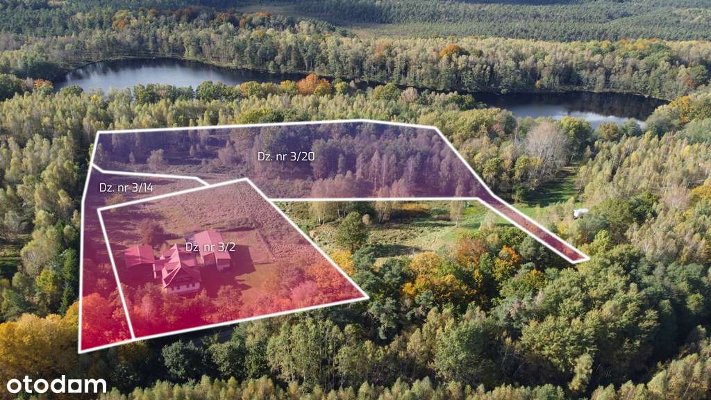 Urocze siedlisko, dwa domy, staw, lasy, jeziora