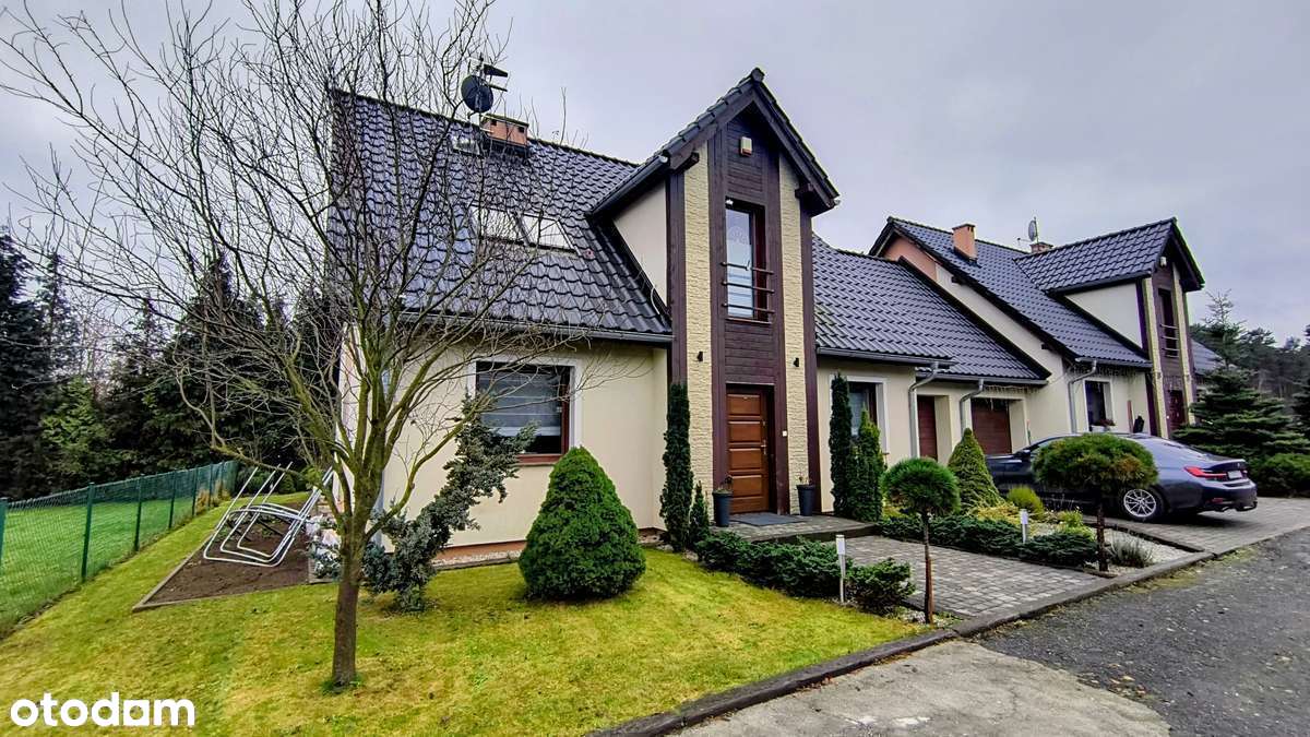 Dom z garażem i ogrodem w zabudowie bliźniaczej przy lesie.