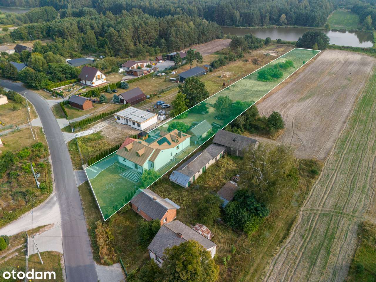 Dom na dużej działce z budynkami gospodarczymi.