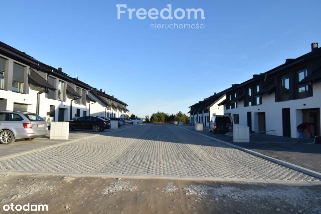 Nowy dom szeregowy z wiatą, fotowoltaiką, skrajna działka.