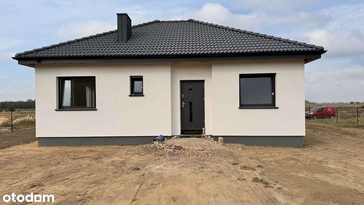 Nowy dom parterowy z wysokim salonem i kuchnią