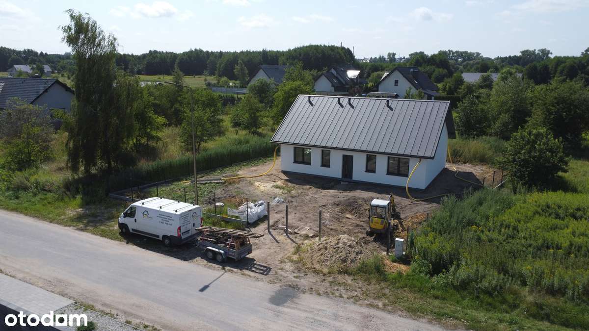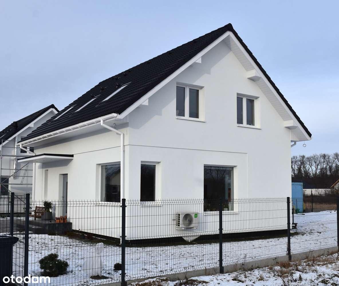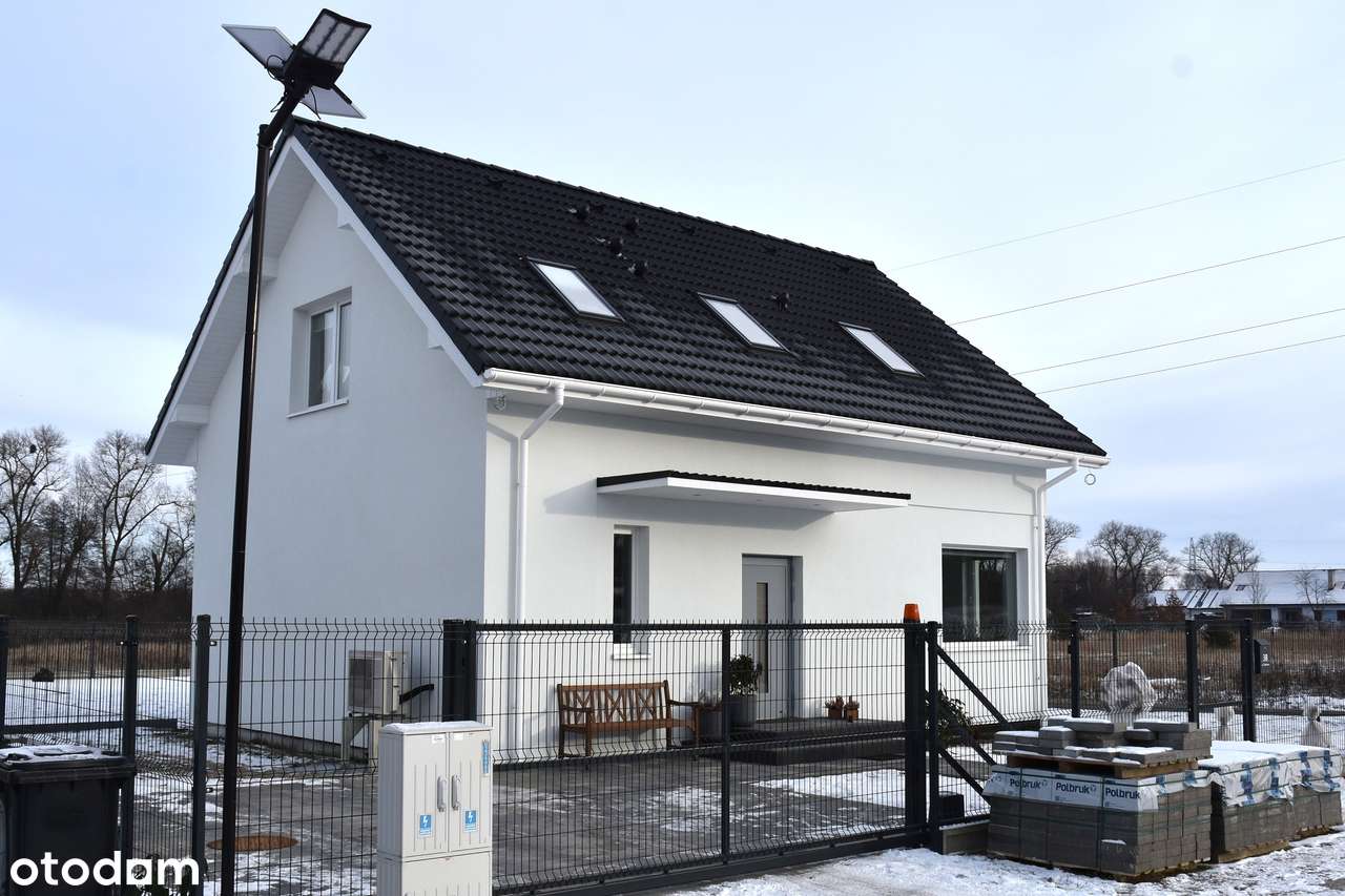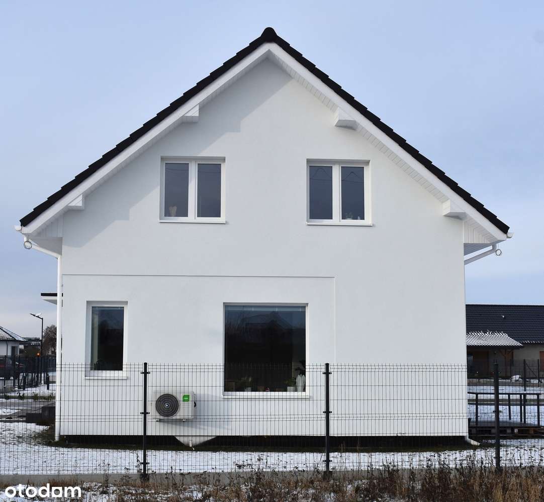 Nowy dom przy drodze asfaltowej z pompą ciepła