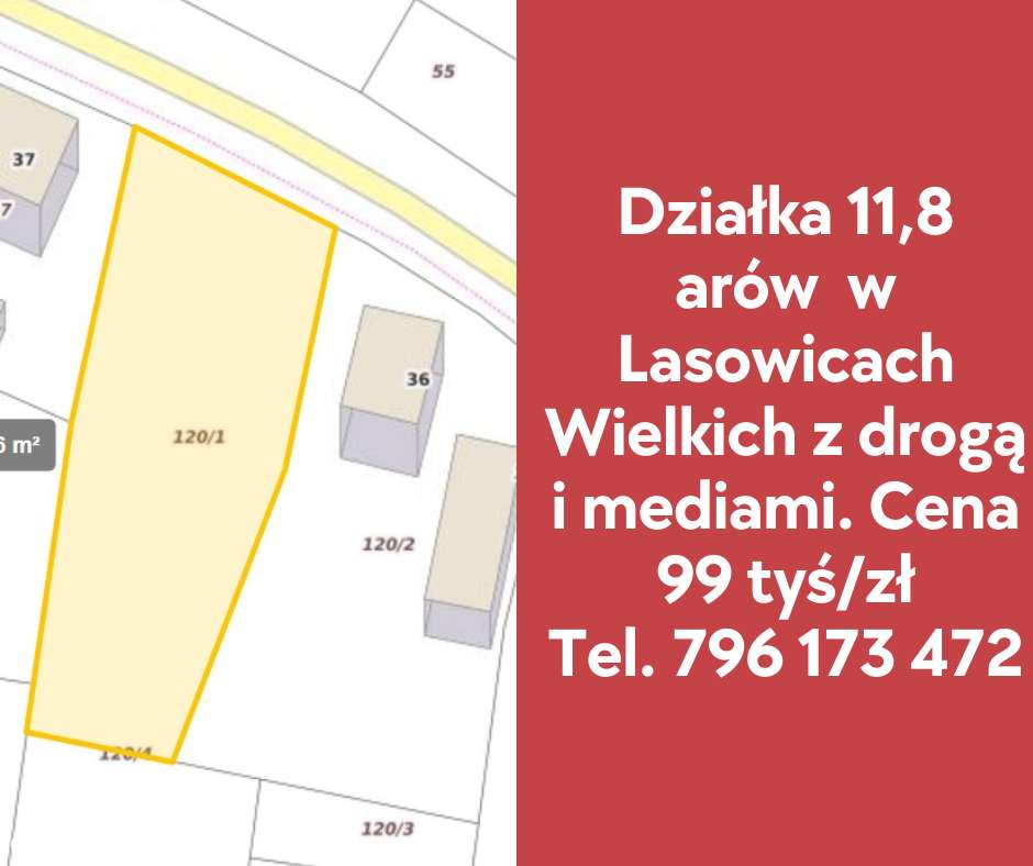Działka 11,8 ara z mediami i drogą asfaltową.