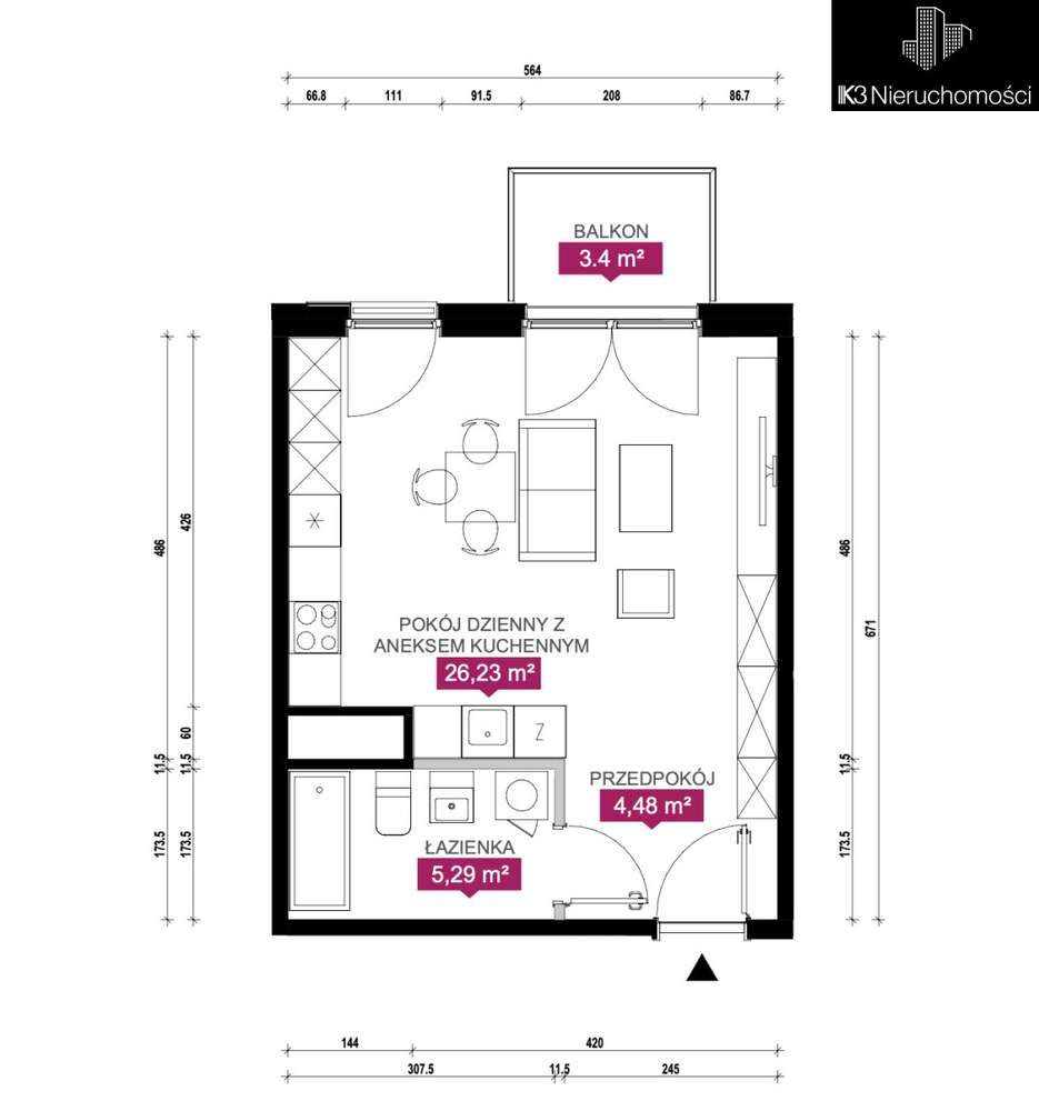 1-pokojowe mieszkanie 29m2 + 2 balkony