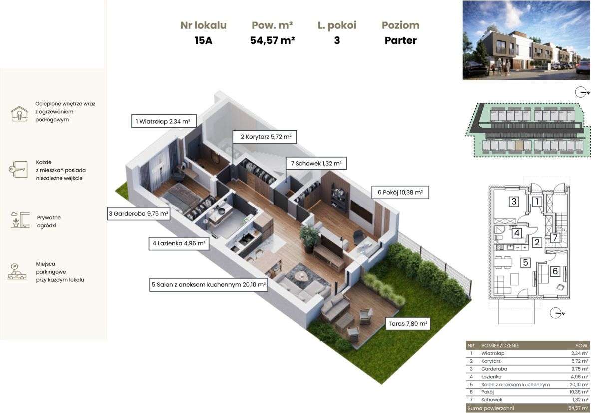 Mieszkanie 3 pok. 61m2 + ogród + parking