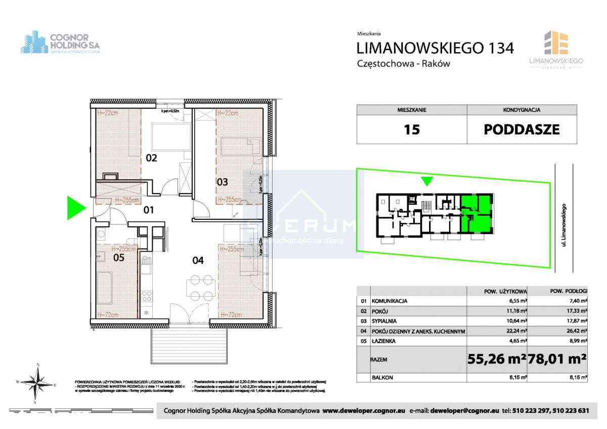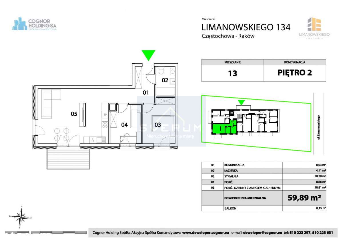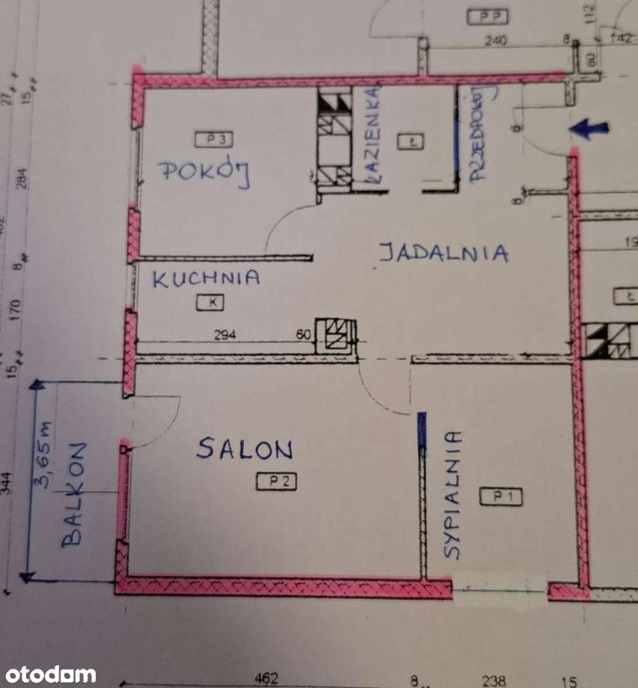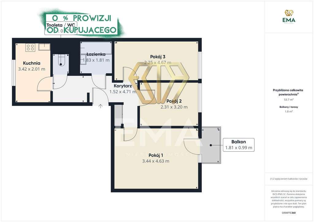 3 pokoje, 54.3 m2, balkon 1,3m2 x 3,6m2, własne miejsce parkingowe