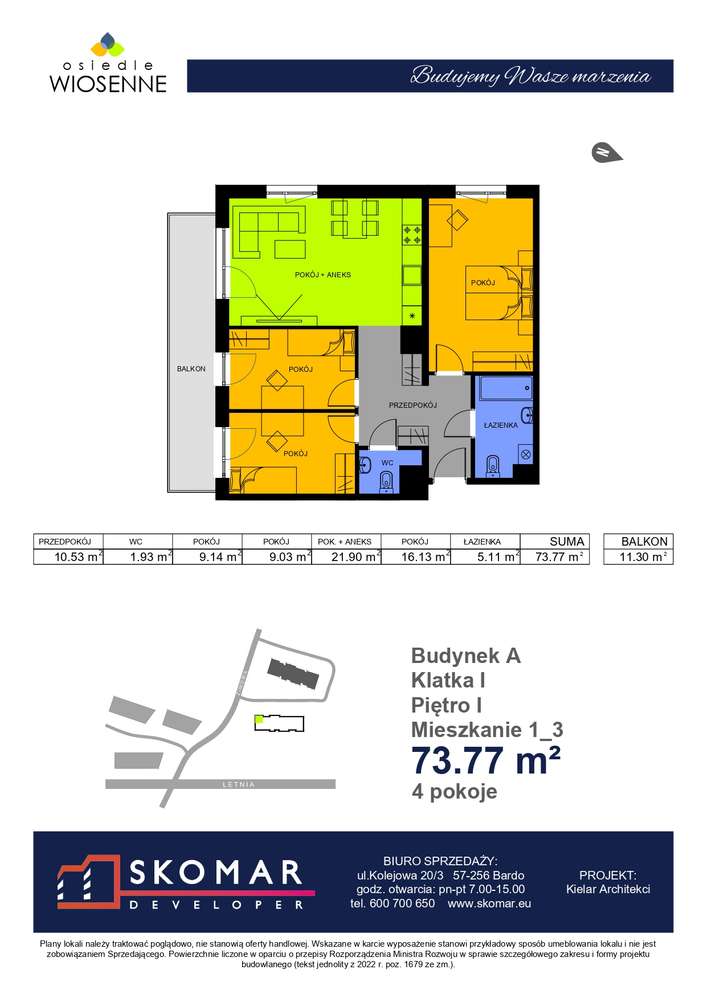 Ul.Letnia, 3 pokoje, 69,9 m², 2 balkony, stan deweloperski, I piętro