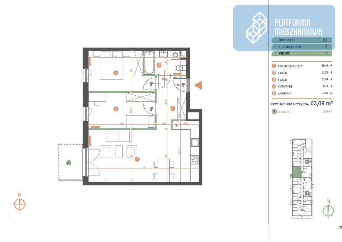 3-pokojowe mieszkanie 59m2 + balkon