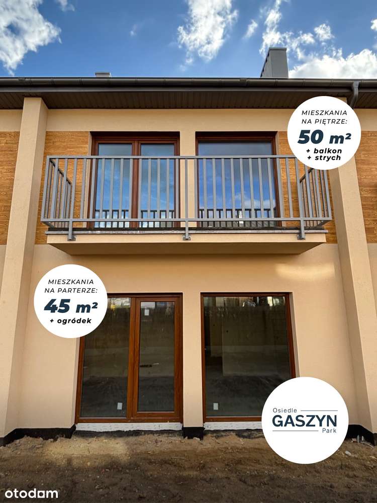 OpisOSTATNIE MIESZKANIE!!!Na sprzedaż mieszkanie na parterze z ogródkiem, na kameralnym osiedlu Gaszyn Park w miejscowości Gaszyn.Powierzchnia mieszkania 45,52 m2, lokal z własnym ogródkiem oraz jedny...