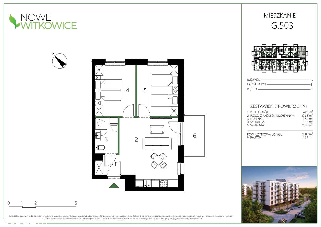 Mieszkanie trzypokojowe 51m2 piąte piętro ( G503)