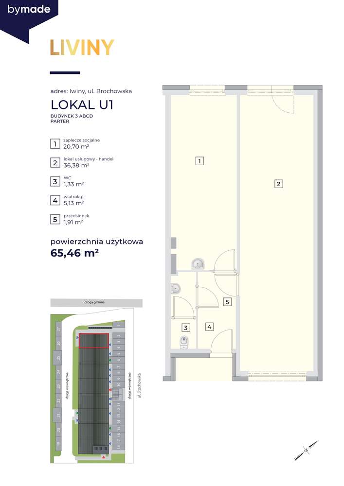 Do wynajęcia od zaraz lokal usługowy z dwoma witrynami o powierzchni 65,46 m², zlokalizowany w Iwinach, w nowoczesnej inwestycji Liviny przy głownej ulicy Brochowskiej. Obok Żabka, Apteka Dr Max, Fryz...