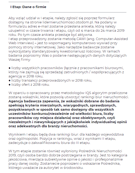 Nad prawidłowym przebiegiem konkursu czuwa niezależna agencja badawcza – IQS. Podzielone na trzy etapy badanie zostało zaprojektowane w taki sposób, aby było sprawiedliwe dla wszystkich. Dlatego zapraszamy zarówno małe, jak i duże biura, z metropolii oraz z mniejszych miejscowości. Dzięki specjalnie opracowanemu algorytmowi, wszyscy mają szanse.