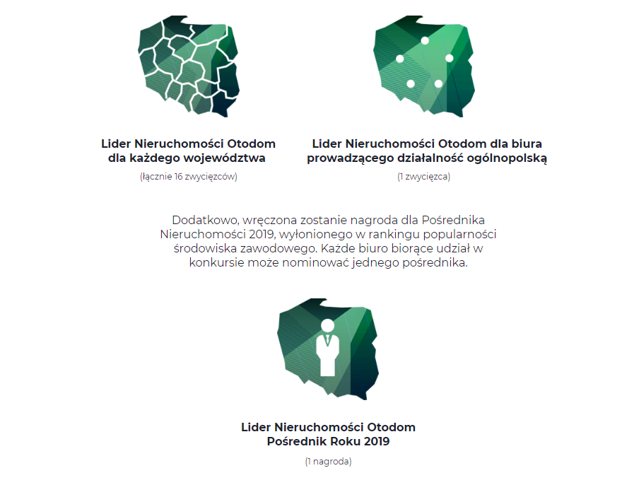 Konkurs Lider Nieruchomości Otodom to doskonała szansa na promocję Twojego biura nieruchomości lub dla Ciebie, jeżeli zostaniesz Pośrednikiem Nieruchomości 2019. Dla laureatów przygotowaliśmy kampanię PR-ową, w skład której wchodzą publikacje m. in. w mediach, takich jak: Gazeta Wyborcza, Wyborcza.pl, Newsweek, Business Insider, Gazeta.pl, Tok.fm oraz w Agencie nieruchomości, na blogu Otodom i w serwisie Otodom.